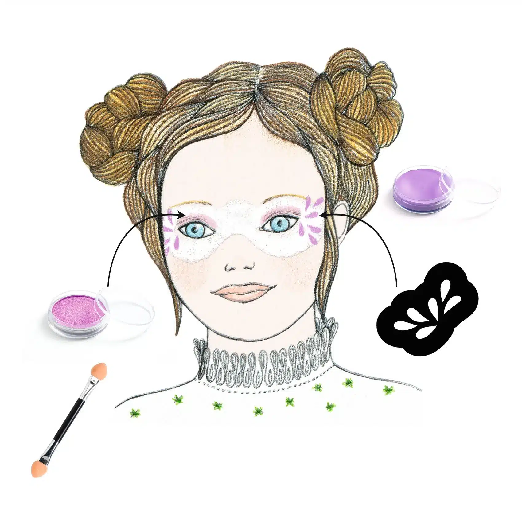 A Djeco prémium minőségű, krémes arcfestékei kiválóan fednek, mégis hagyják a bőrt lélegezni. Nem kell dörzsölni az eltávolításhoz sem: a nap végén kíméletesen, egyszerű vízzel vagy egy kevés kókuszolajjal lemosható, így elkerülhető a pirosodás és a kellemetlen dörzsölés. A készletet ráadásul több mint 75 öntapadós gyöngy és strassz teszi teljessé, amikkel látványos díszítést készíthetsz anélkül, hogy vastag festékréteggel kellene elfedned a gyerek arcát.