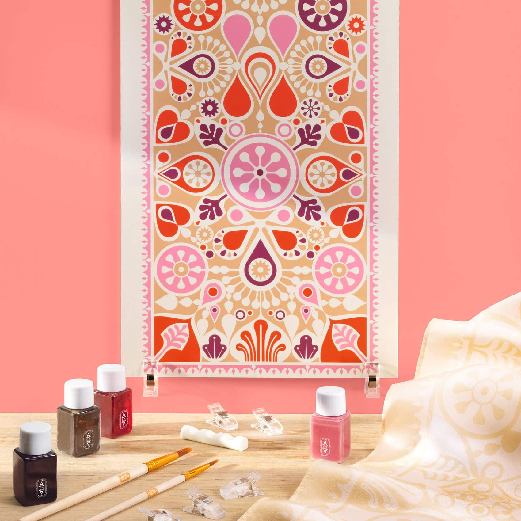 A készlet minden eszközt tartalmaz: előrajzolt, kontúrozott selymet, festékeket, csipeszeket, ecseteket, tartót.