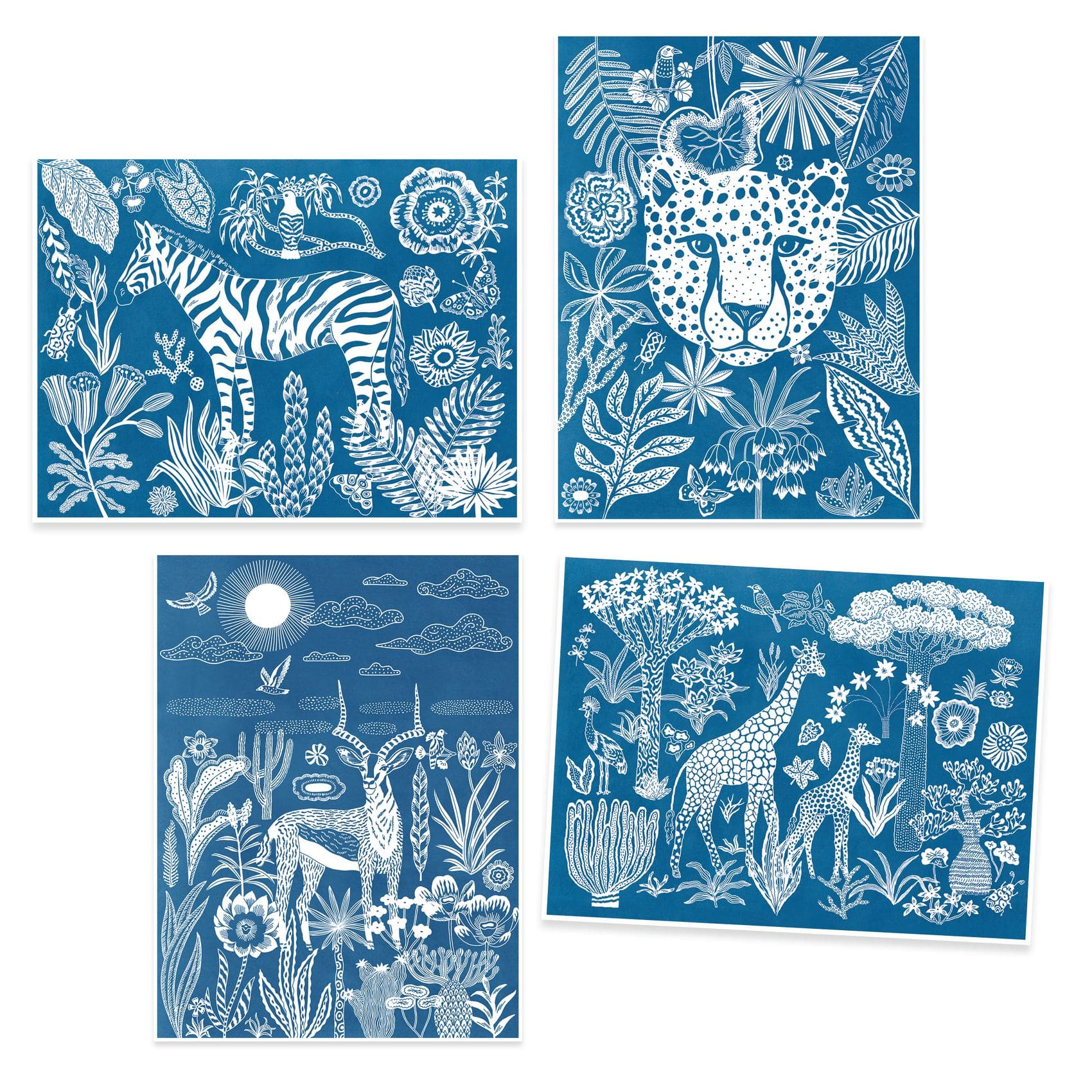 Ha van cianotípia készlet, ami tényleg látványos, akkor ez az. Az „Éjjel a szavannán” dobozban olyan mennyiségű motívum (127 darab!) van, hogy tényleg minden egyes kép más hangulatot kap: zsiráfok, elefántok, akáciák, sziluettek, minták, levelek, virágok — és a kettő kombinációja hozza ki az igazi „szavannai éjszaka” hatást.