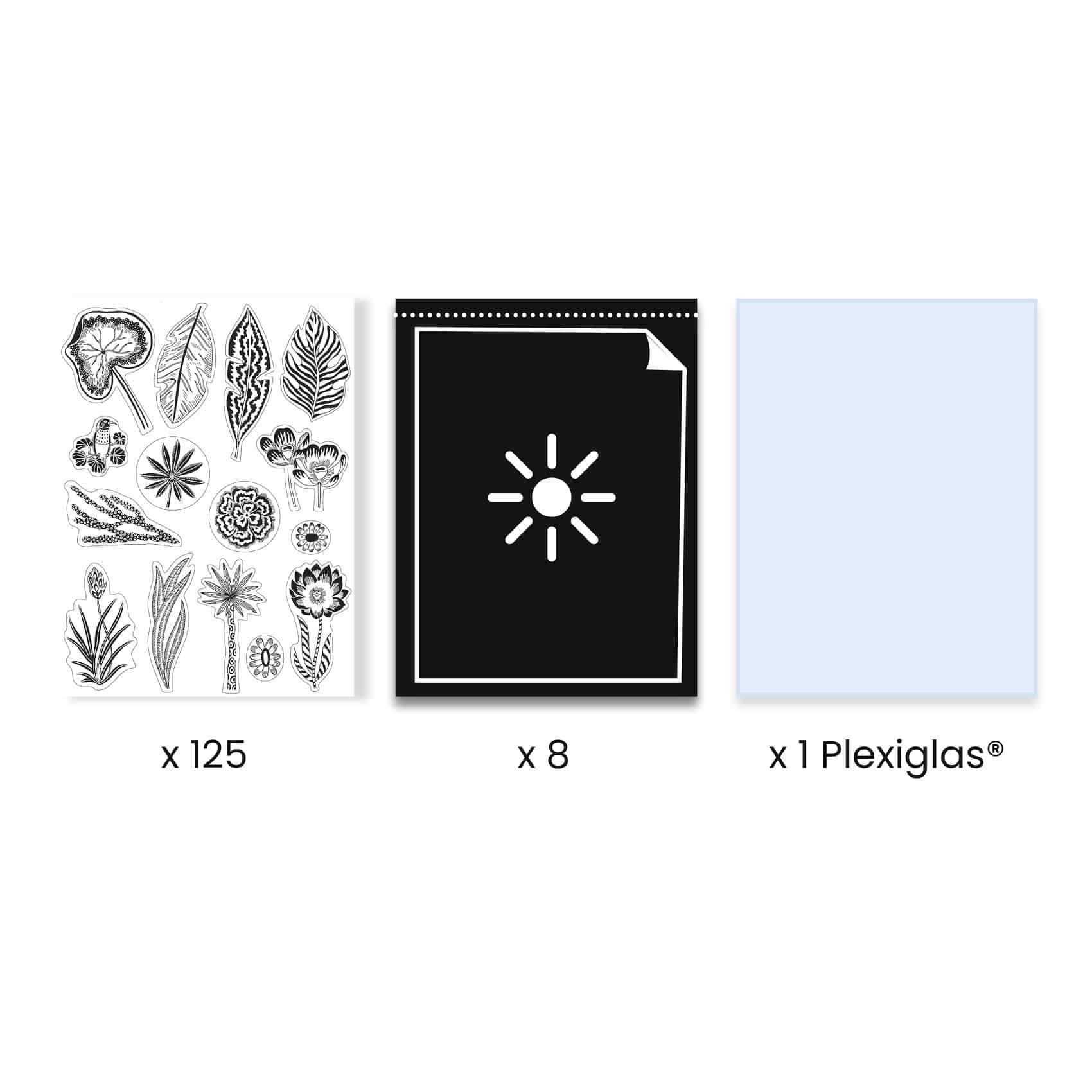 Az Éjjel a szavannán készlet a cianotípia „prémium” változata: nem csak nyomatokat készítesz, hanem komplett, illusztrált jeleneteket építesz, melyeket végül saját keretben tudsz kiállítani. A tematika éjszakai — holdfény, szavanna, állatos növényes motívumok — és ehhez ad 127 előre nyomott, áttetsző mintát.