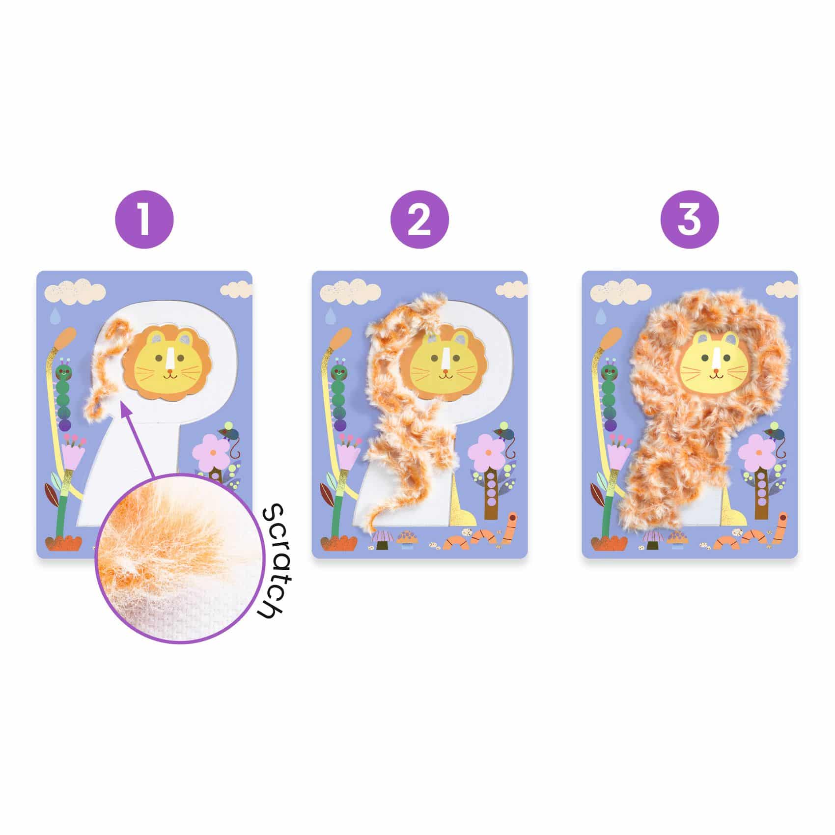 A feladat rendkívül lebilincselő: a készletben található puha gyapjúszálakat kell a Velcro® tépőzárral ellátott állatkartonokra (cica, oroszlán, maci és majom) illesztgetni, ezzel “bundát” adva a csupasz barátoknak. A tevékenység során fejlődik a tapintás érzékelése, a finommotorika és a kreativitás is.