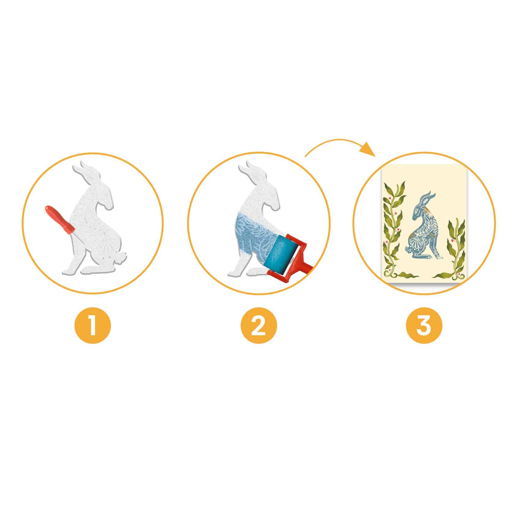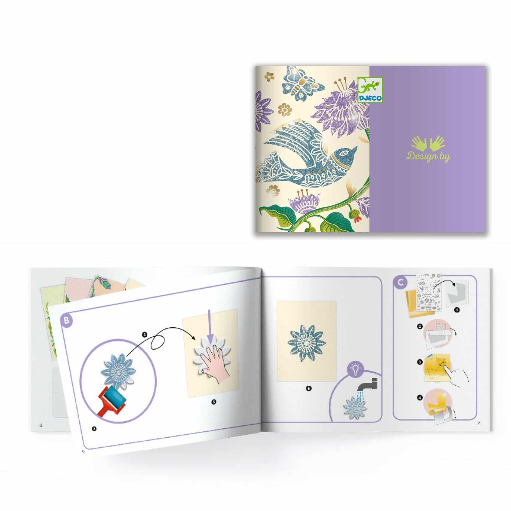 A készlet különlegessége a polisztirol lap, amelybe a gyermek a mellékelt eszközzel különböző vonalakat, pontokat és formákat vájhat – ezzel készítve el saját, egyedi bélyegző mintáit. Az elkészült bélyegzőkkel, festőhenger és festék segítségével színes nyomatokat készíthet a kártyákra.