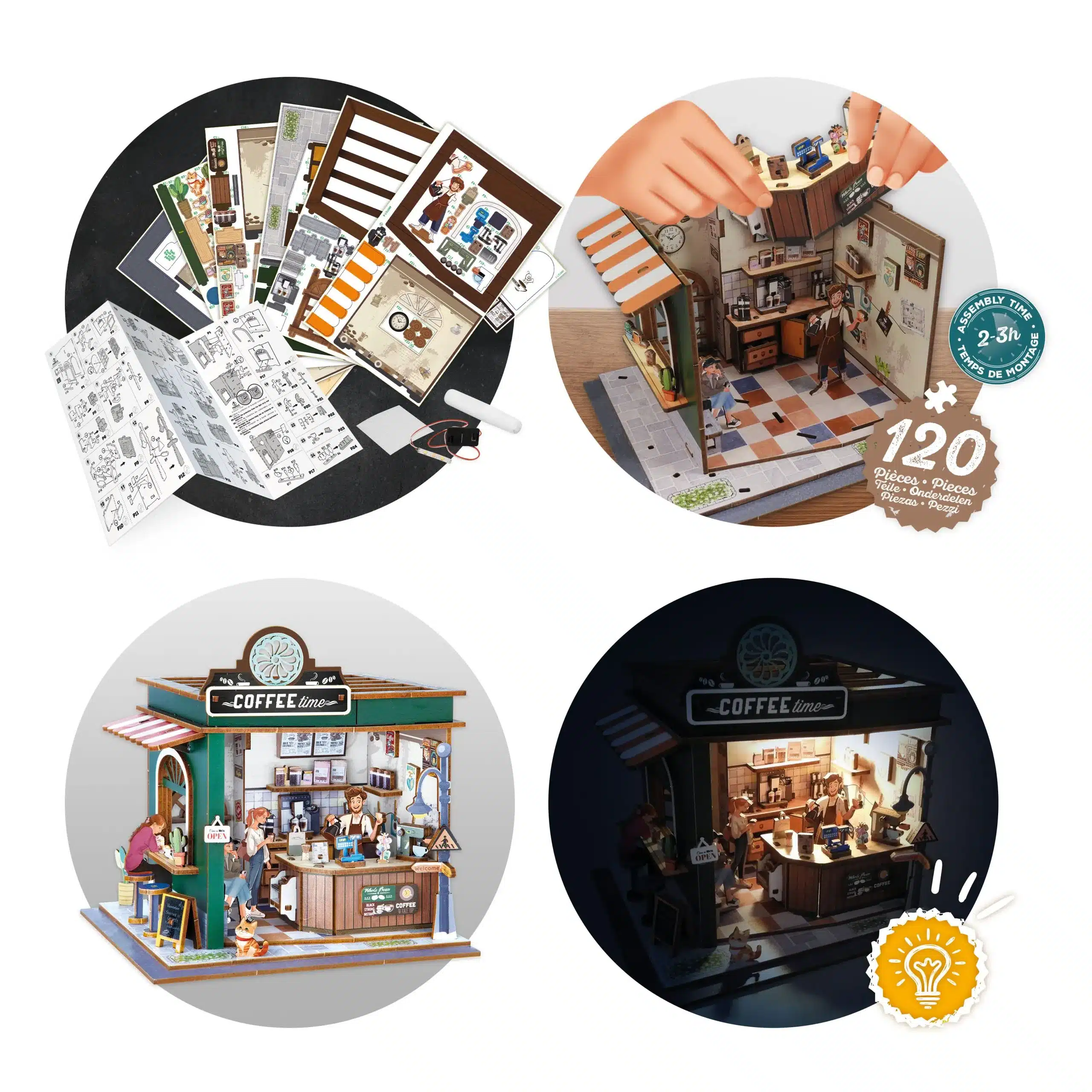 Ez a 120 darabból álló készlet a MiniArt válogatásában a modern modellezés és a kreatív kézműveskedés találkozása. A precízen vágott fa alkatrészeket ragasztással és vágással illesztheted össze, miközben berendezed az üzletet bútorokkal, növényekkel és a kávézás elmaradhatatlan kellékeivel. A folyamat logikus és sikerélményt nyújt a lépésről lépésre haladó, illusztrált útmutatónak köszönhetően, így 10 éves kortól bárki számára élvezetes kihívás. A kész műalkotás a beépített LED-világításnak köszönhetően éjszaka varázslatos, meleg fényt áraszt, így hálószobád különleges dísze lesz.