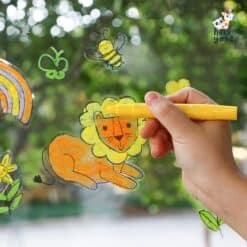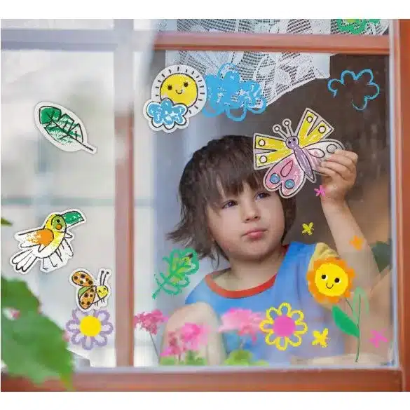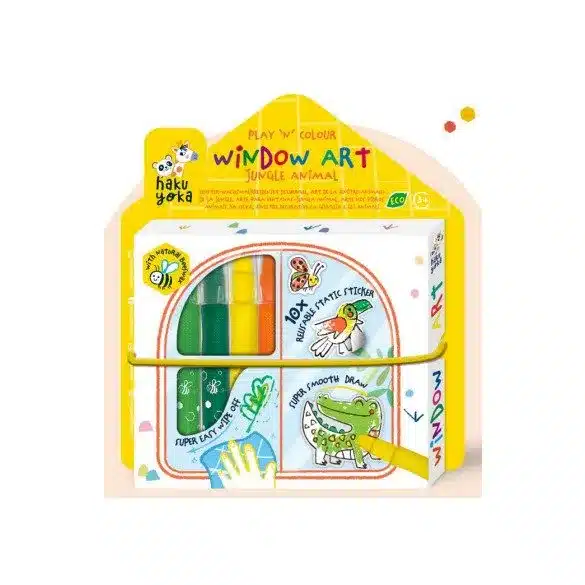 A gyerekek dolga, hogy a mellékelt 4 darab zsírkrétával színt vigyenek a vadállatok életébe. A kréták puha állagúak, jól fognak a matricán, de ha a lendület túlcsúszna az üvegre, egy nedves kendővel másodpercek alatt letörölhető a nyomuk. Mivel a matricák újrapozícionálhatóak, a krokodilok, papagájok és majmok naponta új helyet kaphatnak a gyerekszoba ablakán, így a játék nem ér véget az első színezés után.