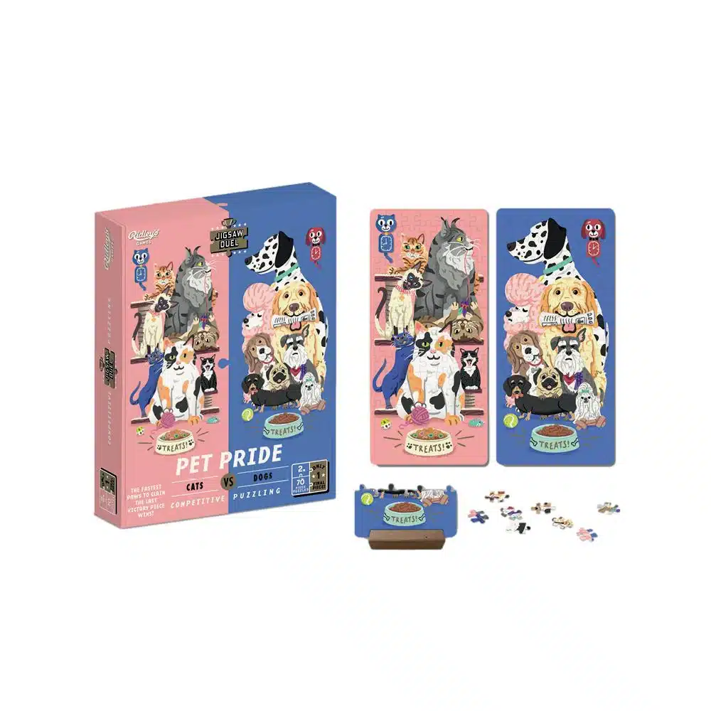 Macskaimádók vagy kutyarajongók? Most kiderül, ki az igazi kirakós mester! A Ridley’s Games Kis kedvencek kétszemélyes puzzle párbaj szettje garantáltan felpörgeti a baráti társaságokat és családi összejöveteleket. Ez a különleges kirakós készlet két puzzle-t tartalmaz, amelyek mindegyike 70 darabból áll – az egyik a cicabarátoknak, a másik pedig a kutyakedvelőknek szól. Azonban a játék igazi csavarja az utolsó darabban rejlik, amely mindkét puzzle-t befejezi. A kérdés csak az: ki lesz az első, aki megszerzi és beilleszti?